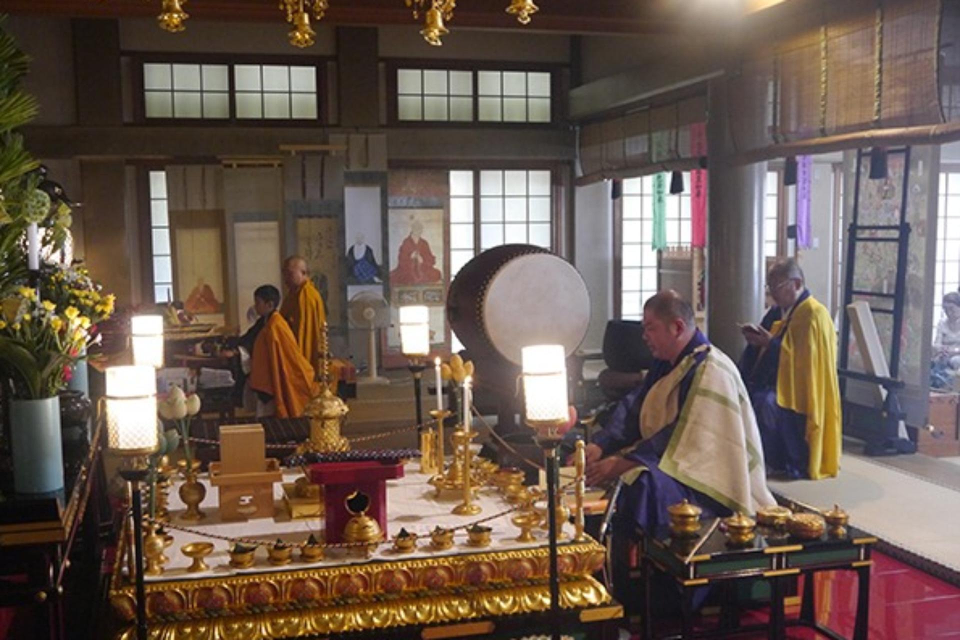 駕龍寺は開創以来たくさんの御精霊をお祀りし、毎年たくさんの御納骨される方がいらっしゃいます。 お盆の行事も一段落した毎年8月17日はこれらすべての精霊に対し、施餓鬼供養を致します。 関係寺院でも限られた方が御出仕され、施餓鬼供養を致しますことにより、すべての精霊に功徳を施し、仏徳(ぶっとく)をお積みして差し上げます。 まず、本堂で一座の法会を開いた後、外陣に設けられた施餓鬼棚の前で施餓鬼供養を行います。